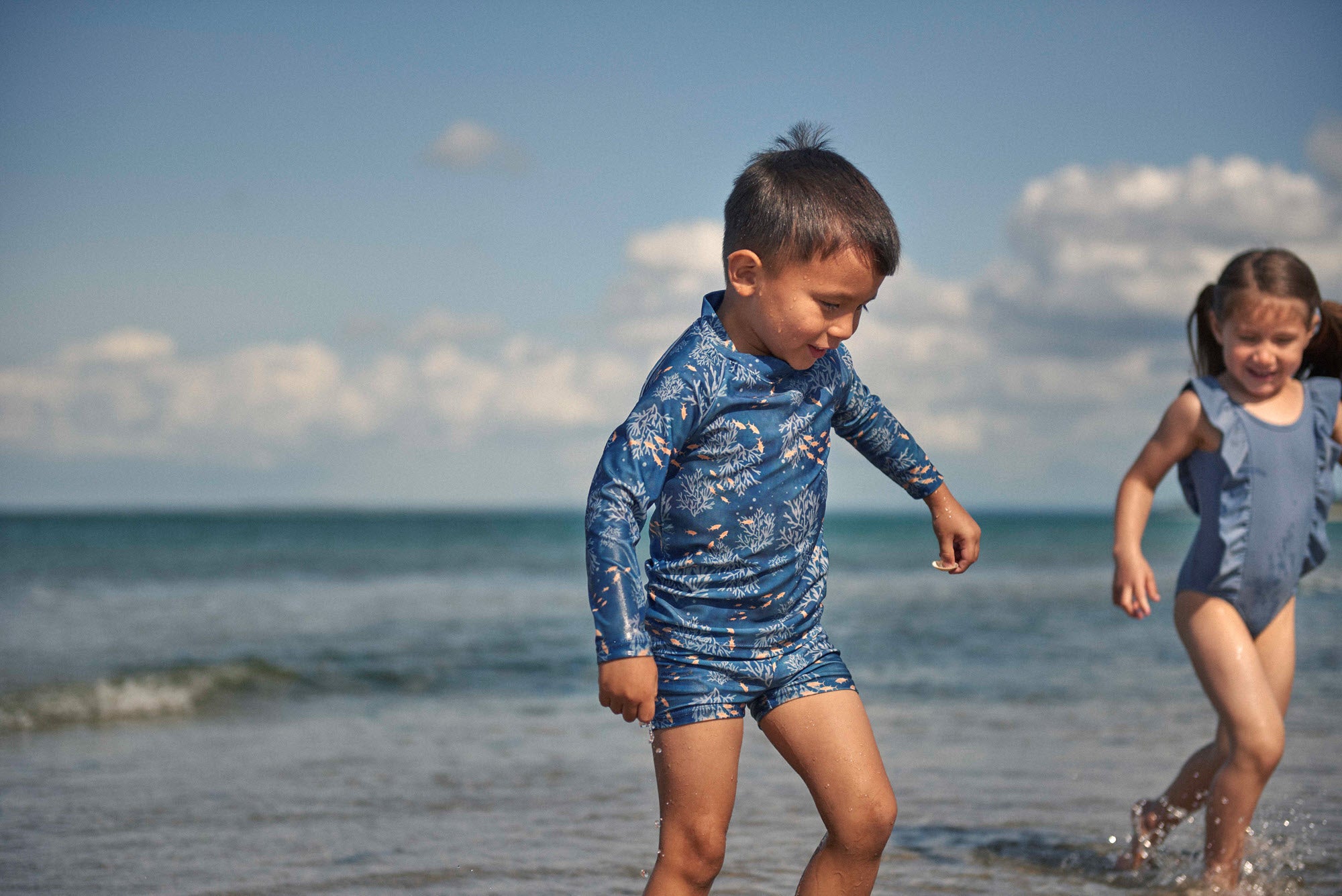 Vores badeshorts og T-shirts er lavet af certificerede materialer, der sikrer optimal bevægelsesfrihed og langvarig holdbarhed. Vores badeshorts og T-shirts er perfekte til vandglade børn uanset om de er på strandet eller i poolen.